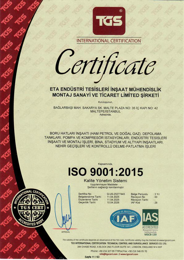 Eta Endüstri Tesisleri   Hizmetlerimiz   Sertifikalar